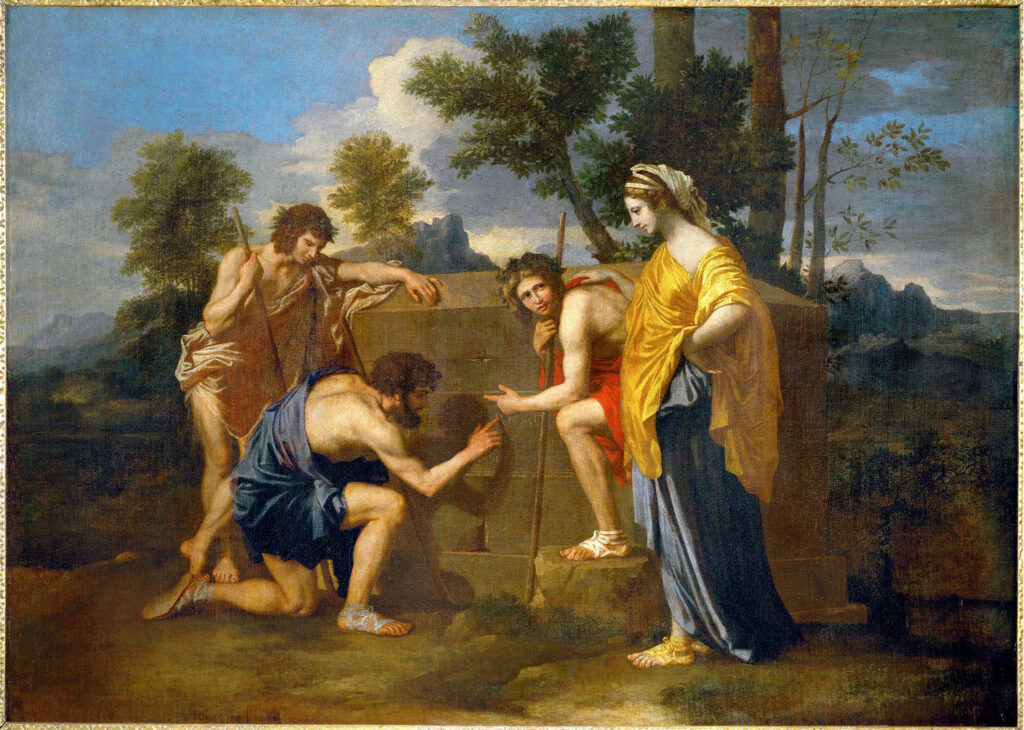 Στον πίνακα αυτόν απεικονίζονται τέσσερις ανθρώπινες μορφές που στέκονται απορημένες γύρω από έναν τύμβο. Περιεργάζονται μια επιγραφή, χαραγμένη στην πέτρα του μνημείου, στην οποία αναγράφεται: “ET IN ARCADIA EGO“, δηλαδή “ΕΓΩ ΤΕ ΕΝ ΑΡΚΑΔΙΑ”. Αν και στα Λατινικά, η επιγραφή δεν χρειάζεται μετάφραση για να αποδοθεί στα Ελληνικά!